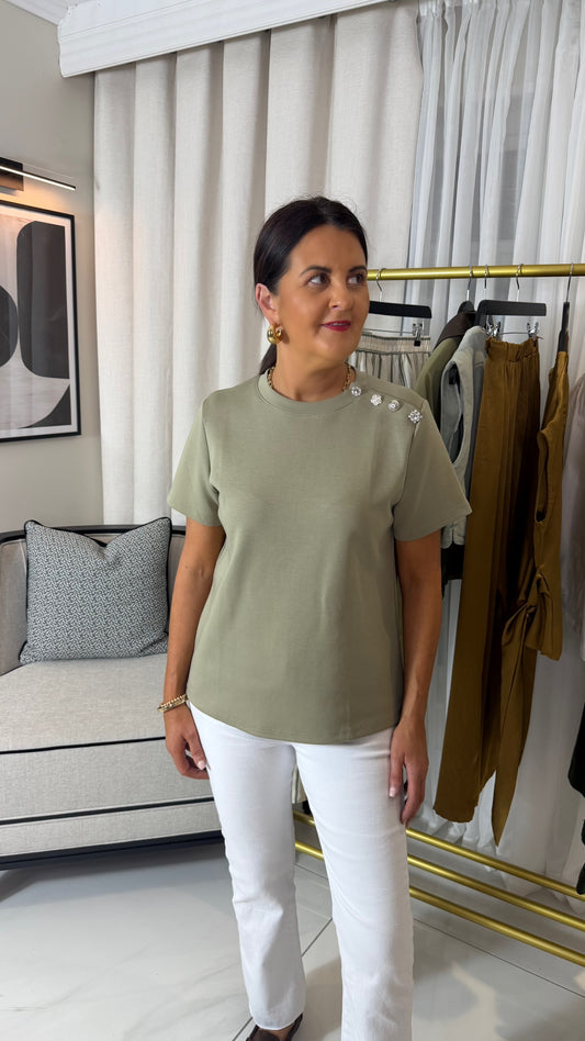 Green Diamantè Button T-Shirt