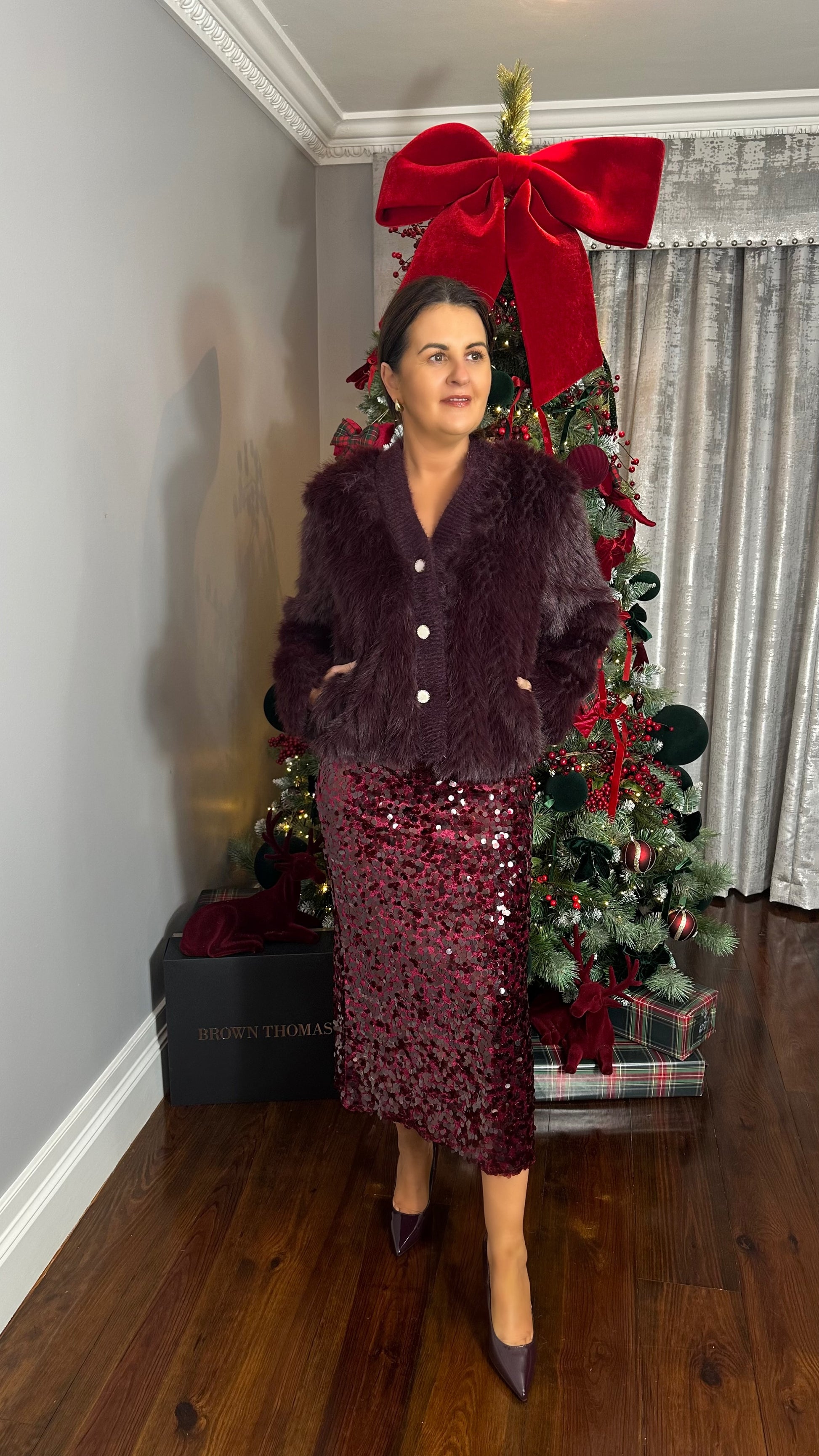 A plush burgundy faux fur cardigan designed to make a statement while feeling irresistibly soft. Featuring a cozy, textured finish with a rich wine-toned knit trim, this piece blends warmth and elegance effortlessly.