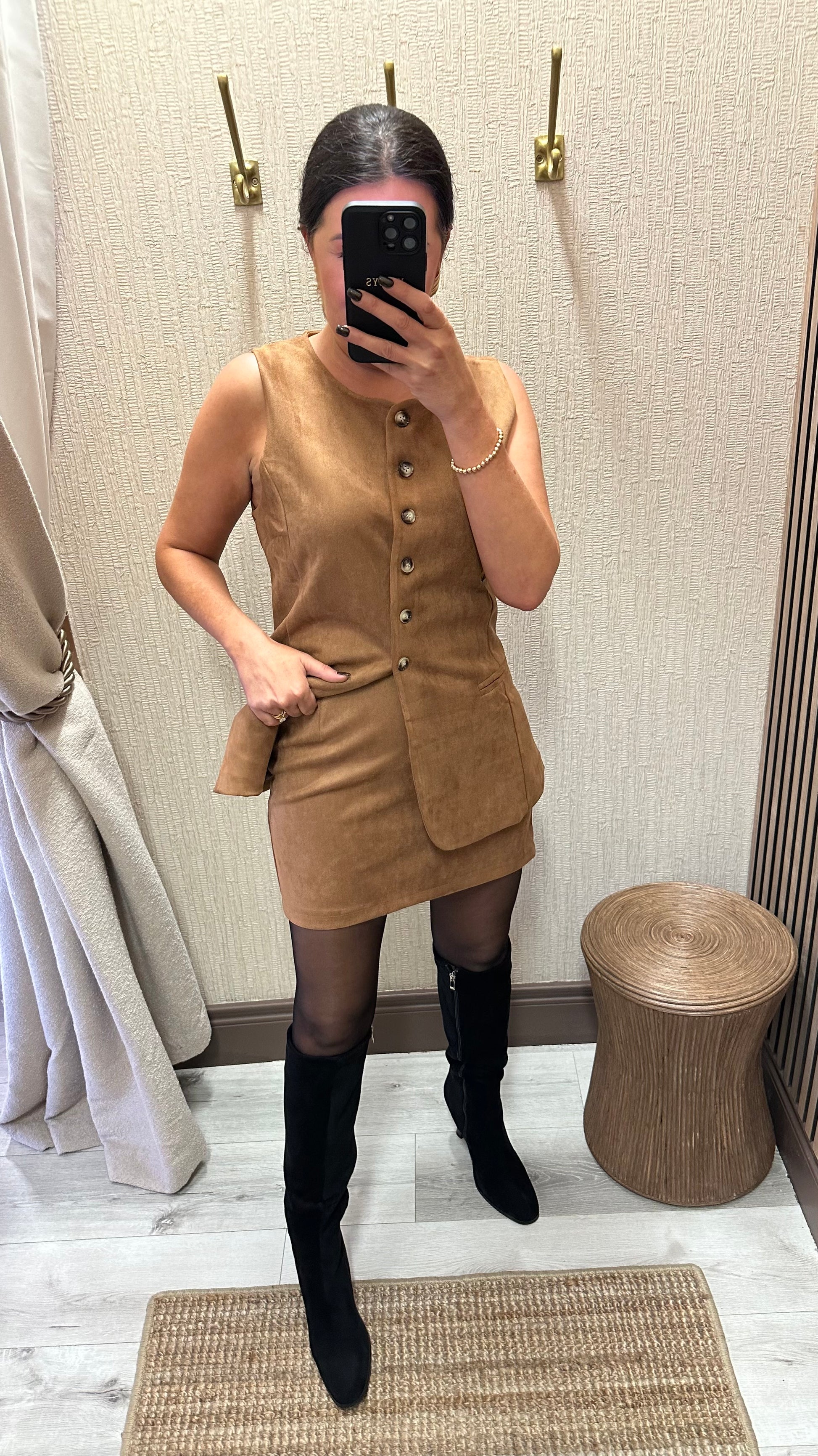 Features: soft & stretchy suedette fabric, zip up the back and mini skirt length. Faux suede.