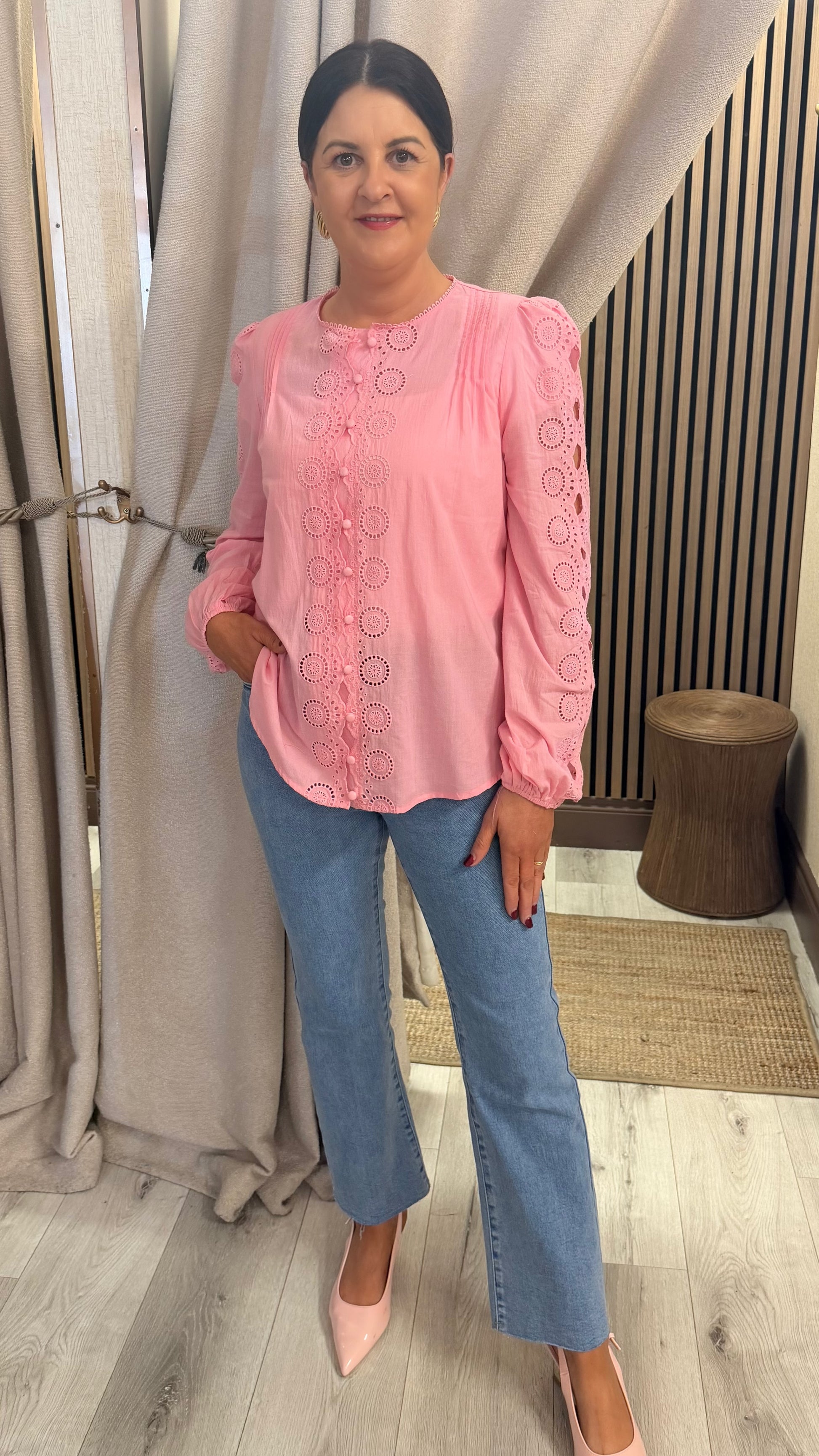 Add a touch of romantic elegance to your wardrobe with this beautifully detailed pink brocade blouse. Crafted from a lightweight, breathable fabric, this piece features intricate brocade-style embroidery running down the front and along the sleeves, creating a timeless yet feminine look. The relaxed silhouette is balanced with softly gathered cuffs and delicate button detailing, making it perfect for both everyday wear and dressed-up occasions.