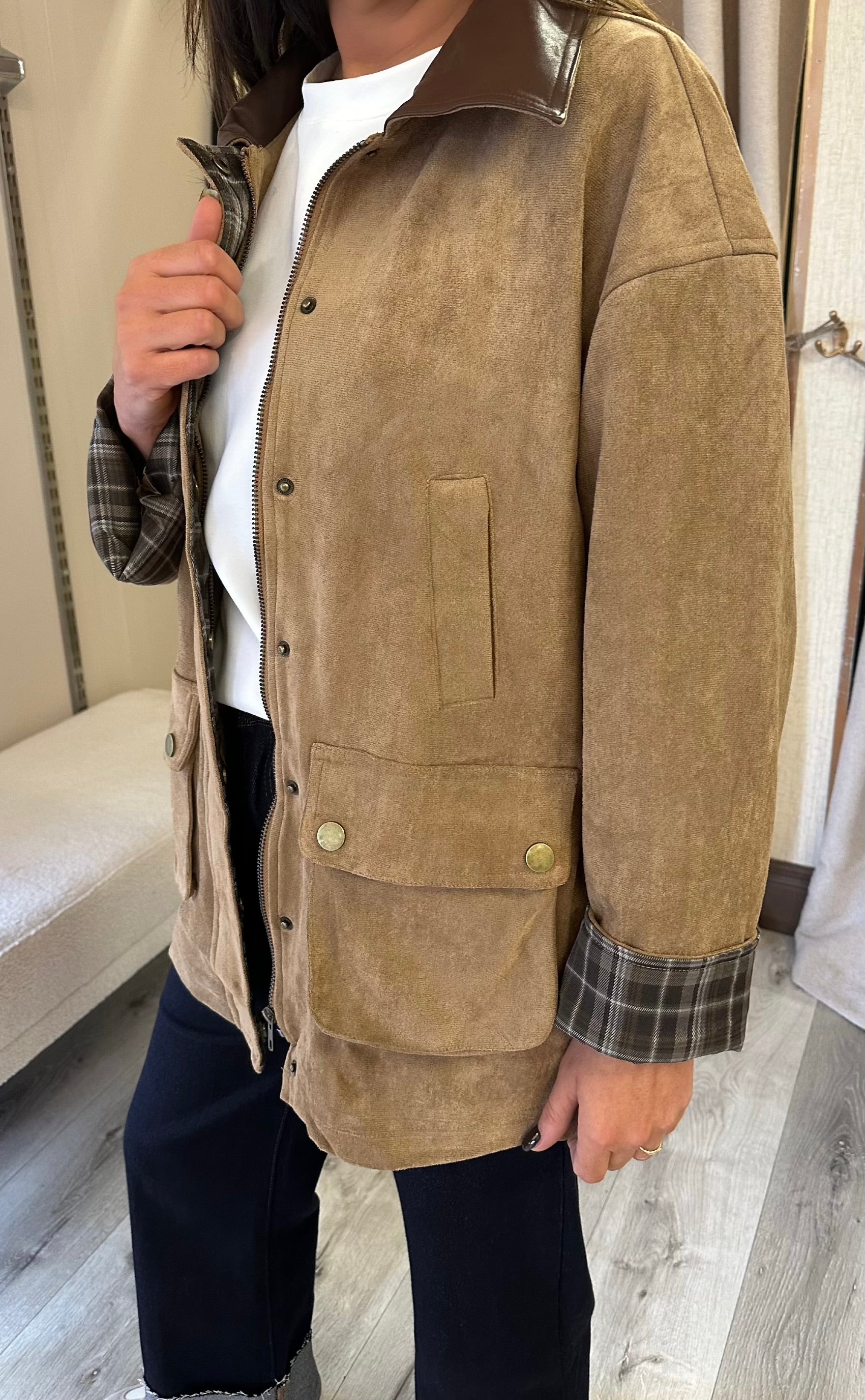 Features: chocolate brown leatherette collar, suedette material, tartan cuffs, 2 functional pockets, 2 breast pockets, zip and popper button closure.